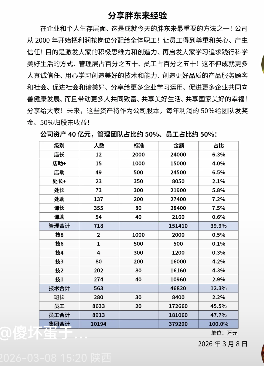 3月8日,于东来公布胖东来40亿元资产利润的分配标准:管理团队占比约50%,员工占比约50%。未来,这些资产将作为公司股本,每年利润的50%给团队发奖金、50%归股东收益。