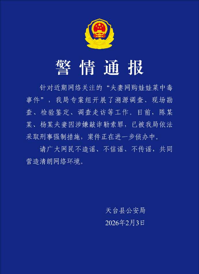 2月3日,针对近期网络关注的“夫妻网购娃娃菜中毒事件”,浙江天台县公安局发布通报,内容如下: 针对近期网络关注的“夫妻网购娃娃菜中毒事件”,天台县公安局专案组开展了溯源调查、现场勘查、检验鉴定、调查走访等工作。 目前,陈某某、杨某夫妻因涉嫌敲诈勒索罪,已被天台县公安局依法采取刑事强制措施,案件正在进一步侦办中。 请广大网民不造谣、不信谣、不传谣,共同营造清朗网络环境。